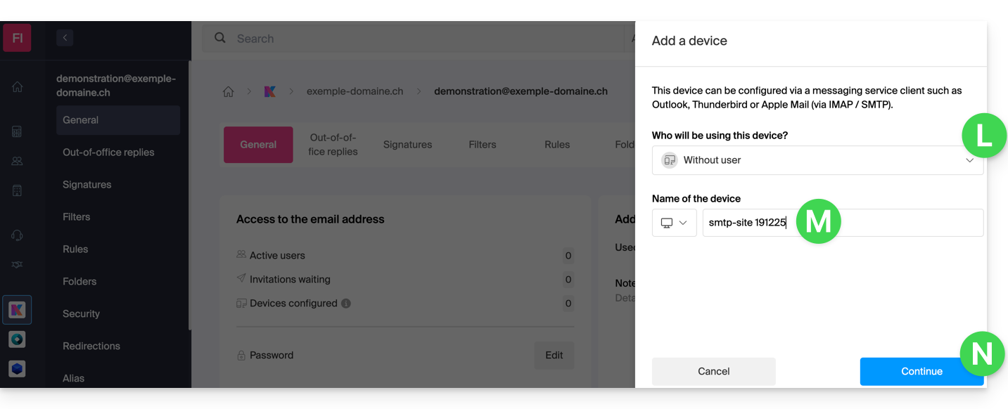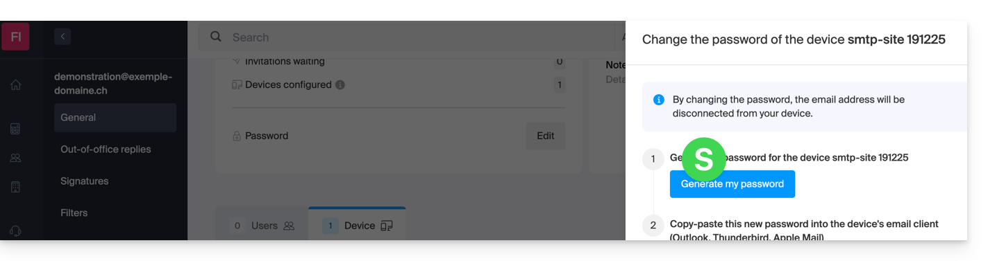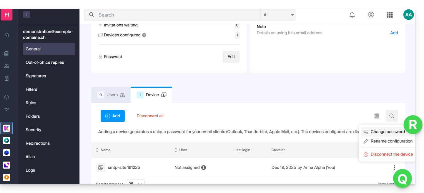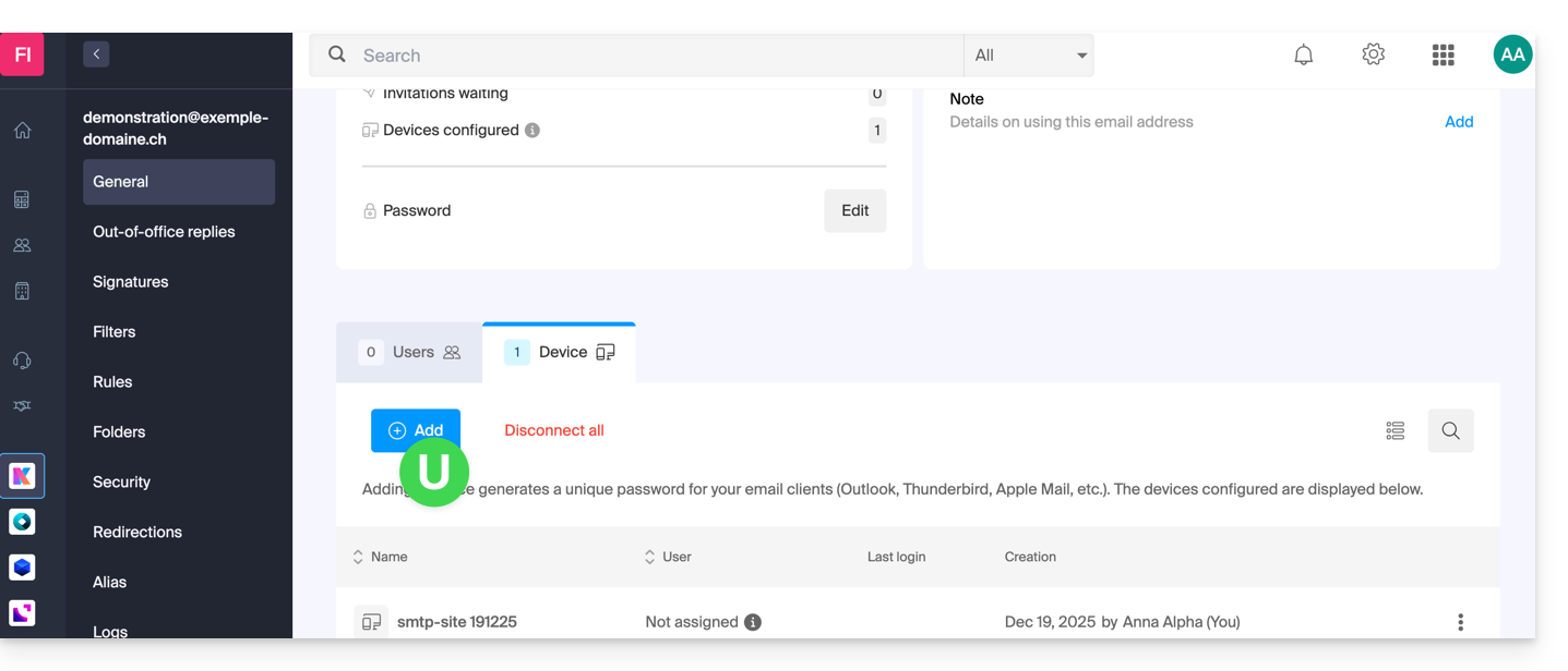 - ottenere una password affinché un utente terzo possa aggiungere l'indirizzo all'interno della propria app Web Mail Infomaniak
