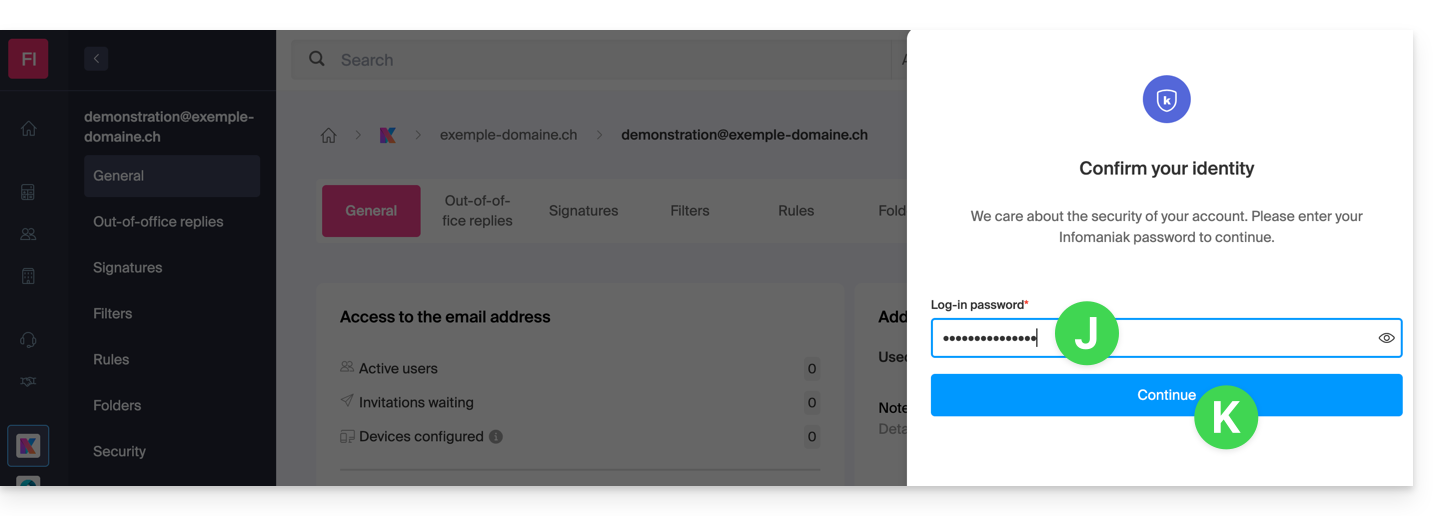 L'animazione seguente mostra questa procedura chiamata "Infomaniak-Recovery" (o “indirizzo di accesso in corso di modifica" a livello degli utenti kSuite):