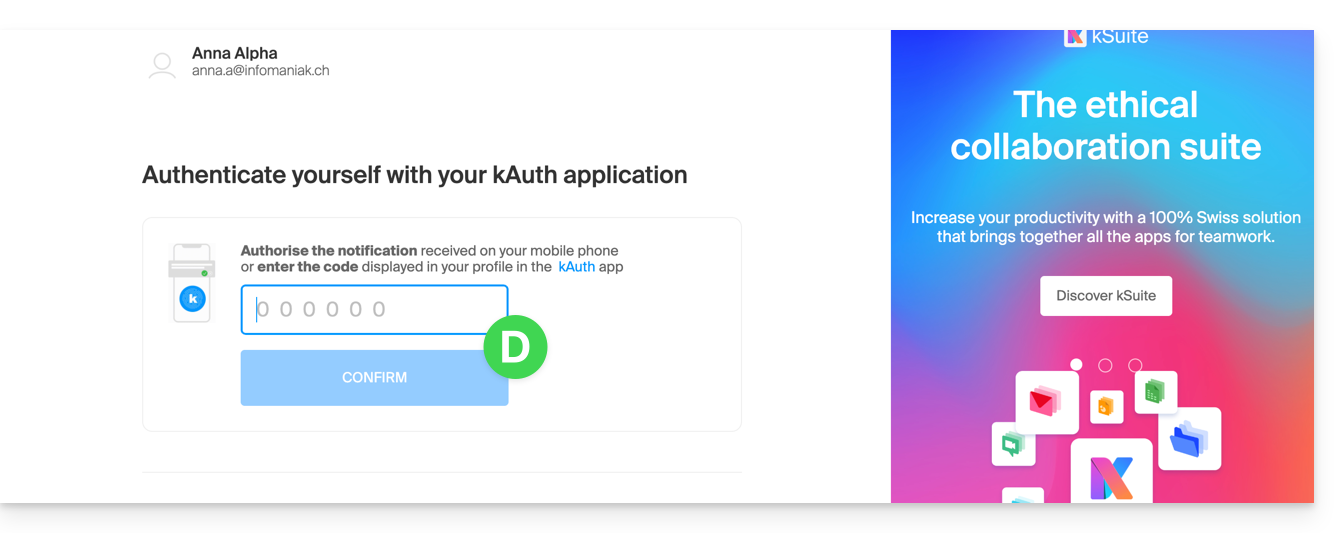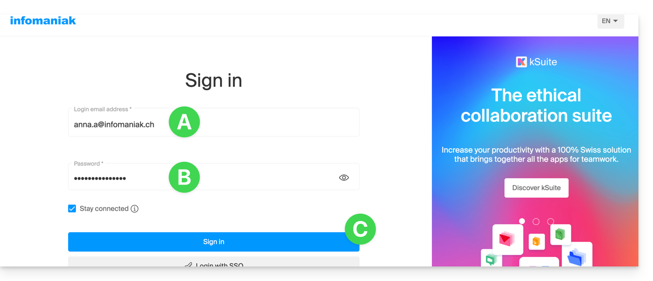 Che si tratti di ksuite.infomaniak.com/mail o dell'app Infomaniak Mail, è indispensabile accedere con l'identificativo del tuo account Infomaniak e la sua password. Non funzionerà indicando direttamente un indirizzo e-mail e la sua password. Comprendere la differenza
